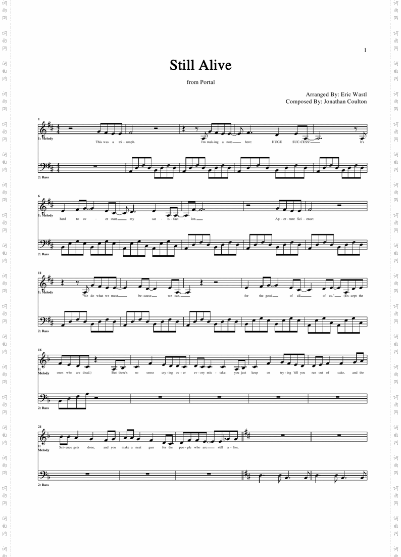 点击页面上方免费下载和打印 StillAlive曲谱,即可免费下载和打印本曲谱全部内容简谱是音乐的密码本,音符是跳动的心电图。琴谱123曲谱网帮助每个热爱音乐的人学习乐器