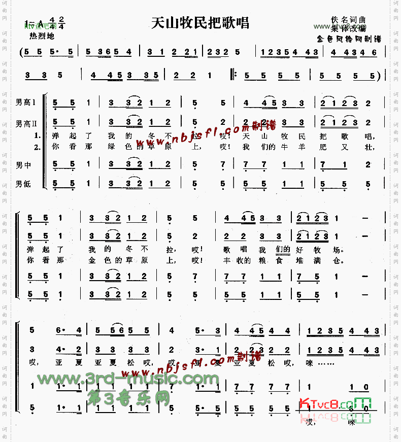 点击页面上方免费下载和打印 天山牧民把歌唱[合唱曲谱]曲谱,即可免费下载和打印本曲谱全部内容简谱是音乐的密码本,音符是跳动的心电图。琴谱123曲谱网帮助每个热爱音乐的人学习乐器