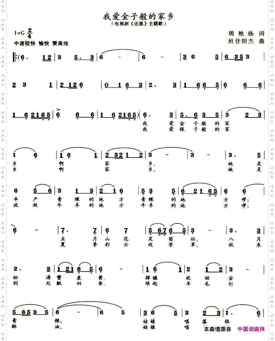点击页面上方免费下载和打印 我爱金子般的家乡电视剧《还愿》主题歌曲谱,即可免费下载和打印本曲谱全部内容简谱是音乐的密码本,音符是跳动的心电图。琴谱123曲谱网帮助每个热爱音乐的人学习乐器