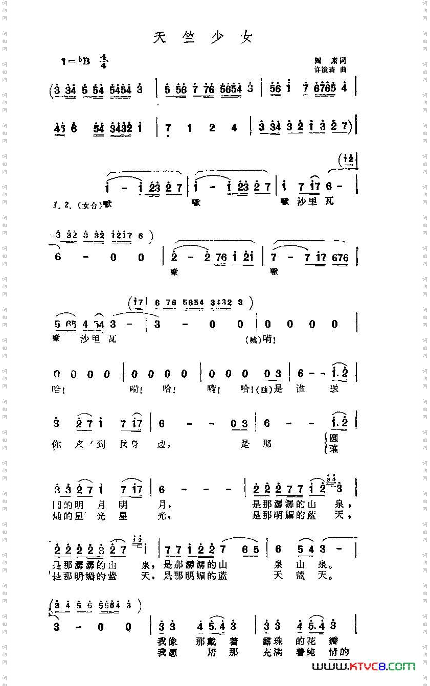 点击页面上方免费下载和打印 天竺少女曲谱,即可免费下载和打印本曲谱全部内容简谱是音乐的密码本,音符是跳动的心电图。琴谱123曲谱网帮助每个热爱音乐的人学习乐器