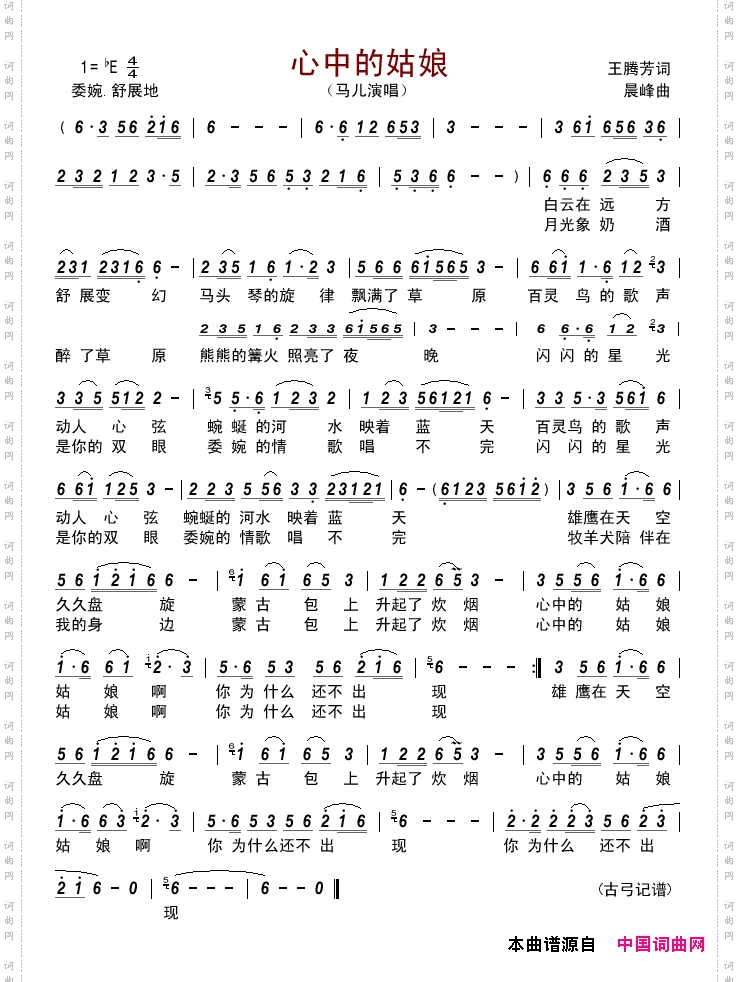 点击页面上方免费下载和打印 心中的姑娘曲谱,即可免费下载和打印本曲谱全部内容简谱是音乐的密码本,音符是跳动的心电图。琴谱123曲谱网帮助每个热爱音乐的人学习乐器