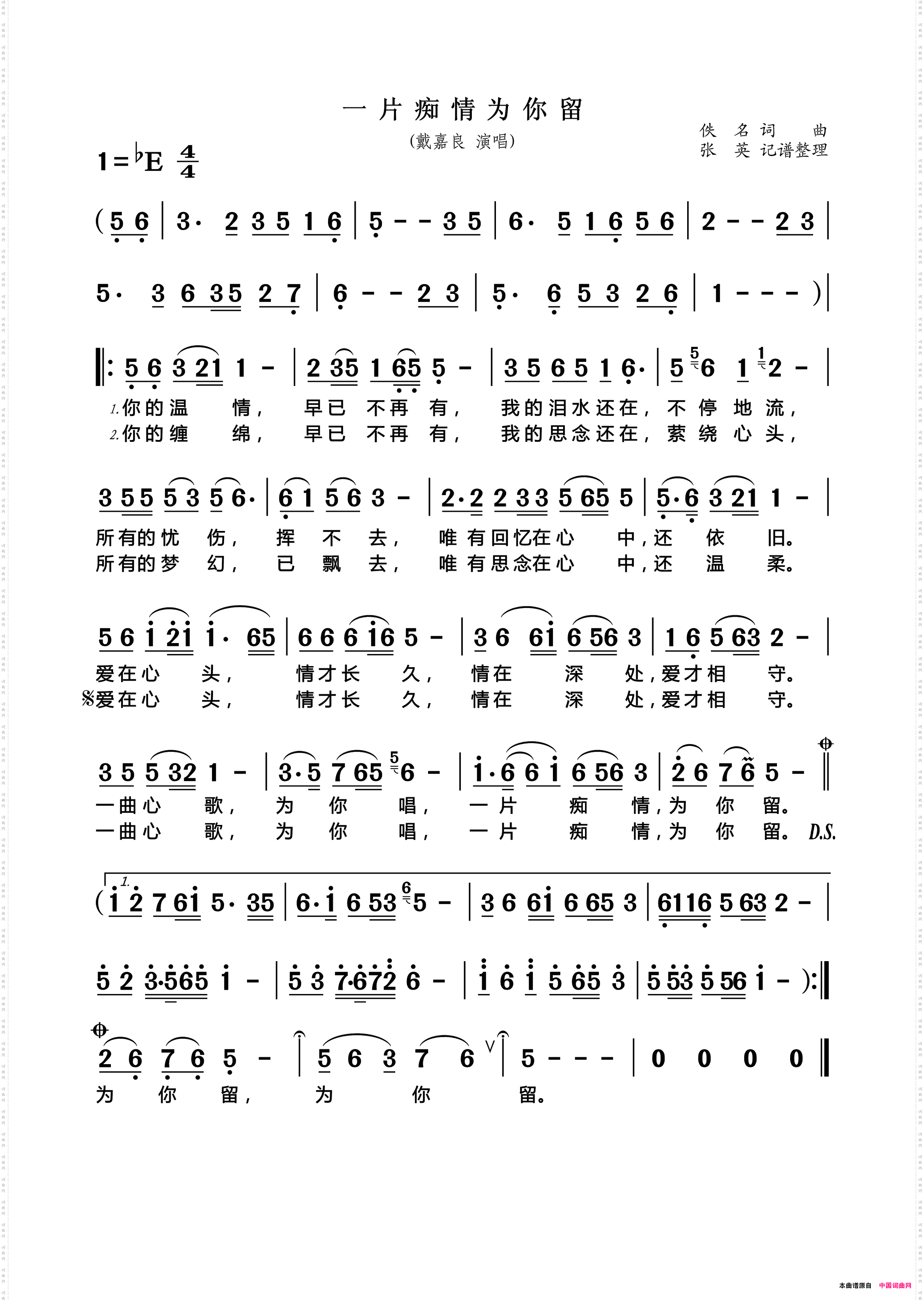 点击页面上方免费下载和打印 一片痴情为你留曲谱,即可免费下载和打印本曲谱全部内容简谱是音乐的密码本,音符是跳动的心电图。琴谱123曲谱网帮助每个热爱音乐的人学习乐器