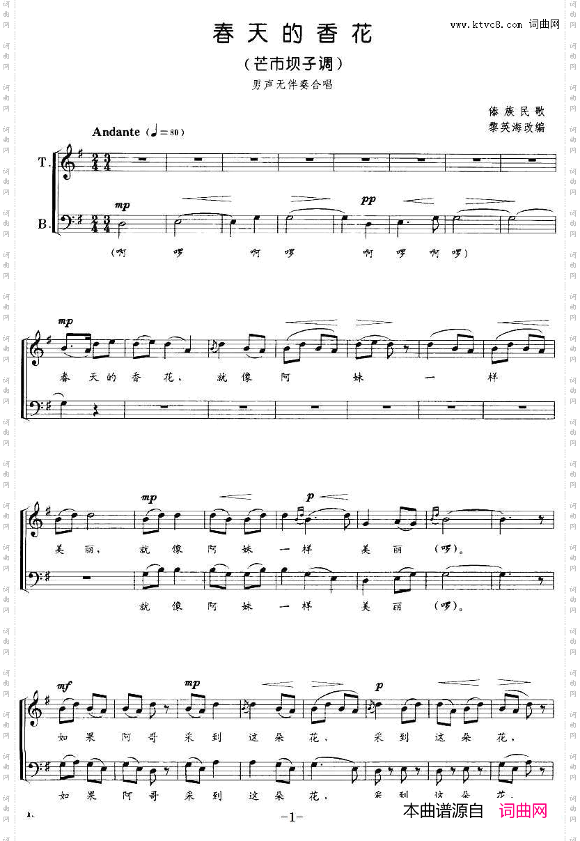 点击页面上方免费下载和打印 春天的香花芒市坝子调男声无伴奏合唱、五线谱曲谱,即可免费下载和打印本曲谱全部内容简谱是音乐的密码本,音符是跳动的心电图。琴谱123曲谱网帮助每个热爱音乐的人学习乐器