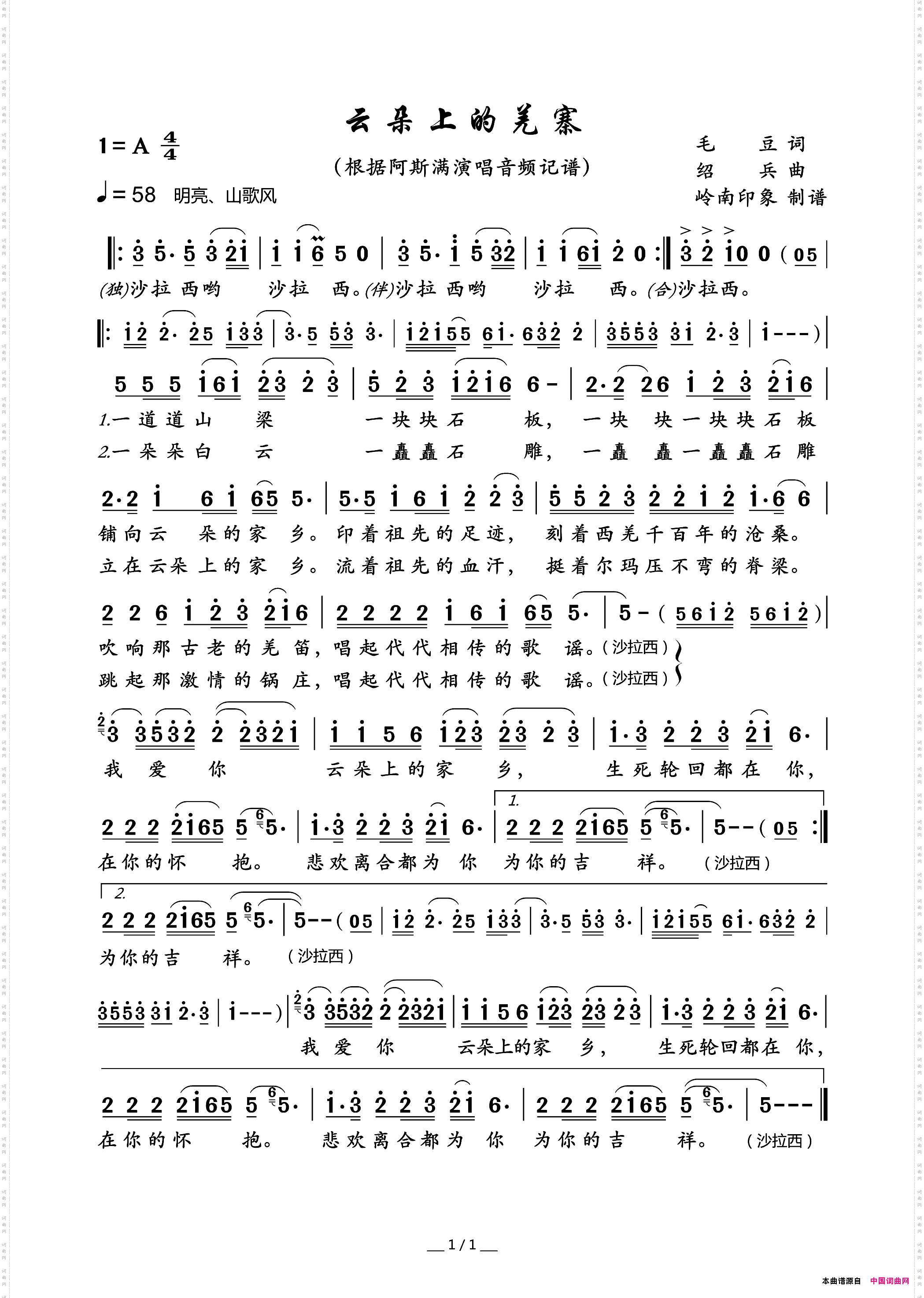 点击页面上方免费下载和打印 云朵上的羌寨曲谱,即可免费下载和打印本曲谱全部内容