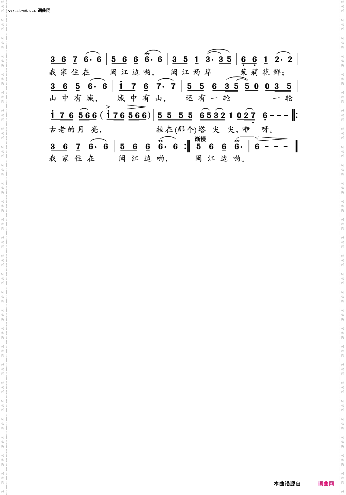 点击页面上方免费下载和打印 家住闽江边曲谱,即可免费下载和打印本曲谱全部内容简谱是音乐的密码本,音符是跳动的心电图。琴谱123曲谱网帮助每个热爱音乐的人学习乐器